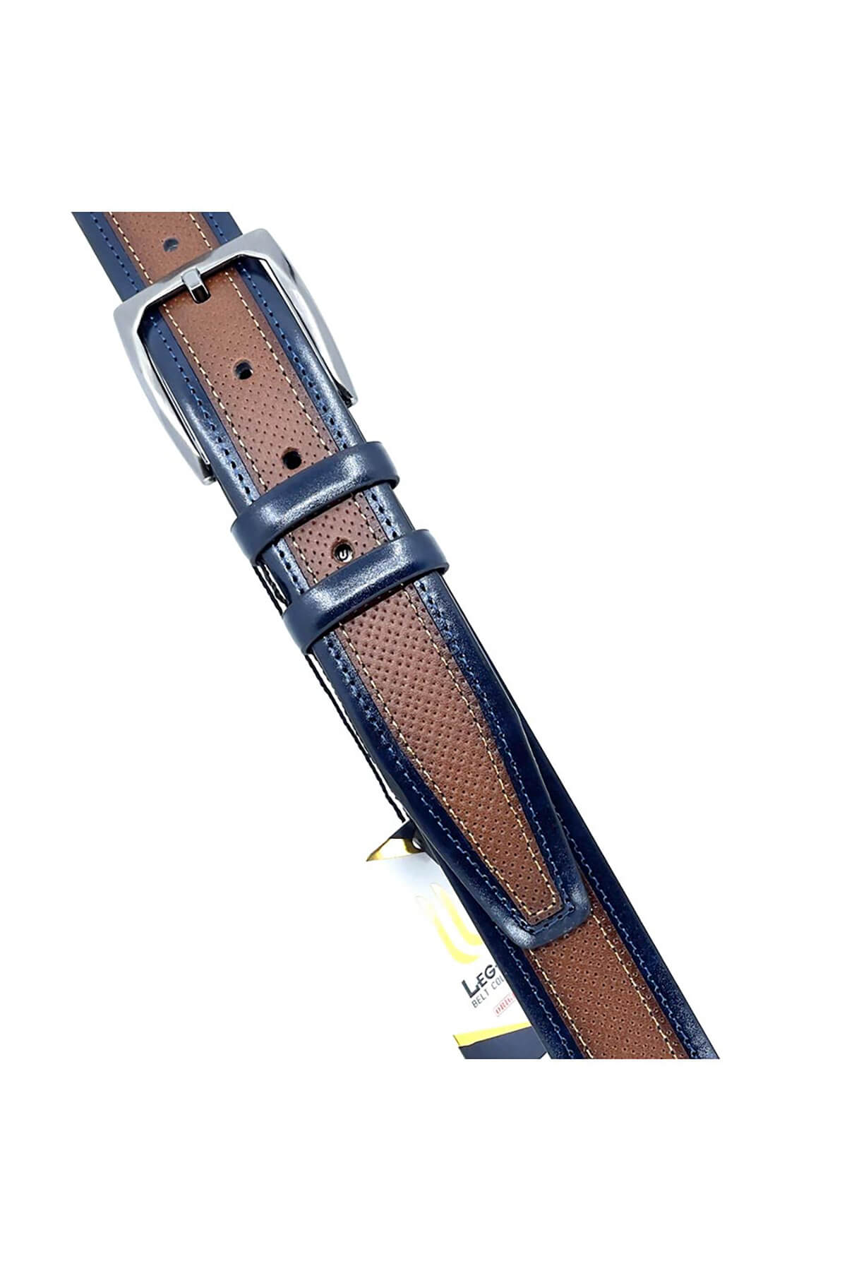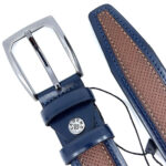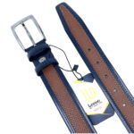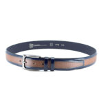 Δερμάτινή δίχρωμη ζώνη 3,5 cm με μεταλλική αγκράφα. Η ζώνη διαθέτει διπλό δαχτυλίδι ενώ ή βίδα που διαθέτει δίνει τη δυνατότητα να τη μικρύνετε πολύ εύκολα. Στο πίσω μέρος είναι τυπωμένο το λογότυπο της εταιρείας όπου συνοδεύεται από τον κωδικό και το μήκος της ζώνης. Στη συγκεκριμένη ζώνη στο μήκος της συμπεριλαμβάνεται η αγκράφα.