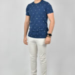 Άνετο μπλουζάκι με κοντά μανίκια και στρογγυλεμένη λαιμόκοψη Αυτό το μπλουζάκι είναι κατασκευασμένο από άνετο ελαστικό βαμβάκι, έχει ένα καλοκαιρινό μίνι τύπωμα παντού και διατίθεται σε διάφορα χρώματα. Εάν βρίσκεστε ανάμεσα σε δύο μεγέθη, επιλέξτε το μεγαλύτερο μέγεθος.