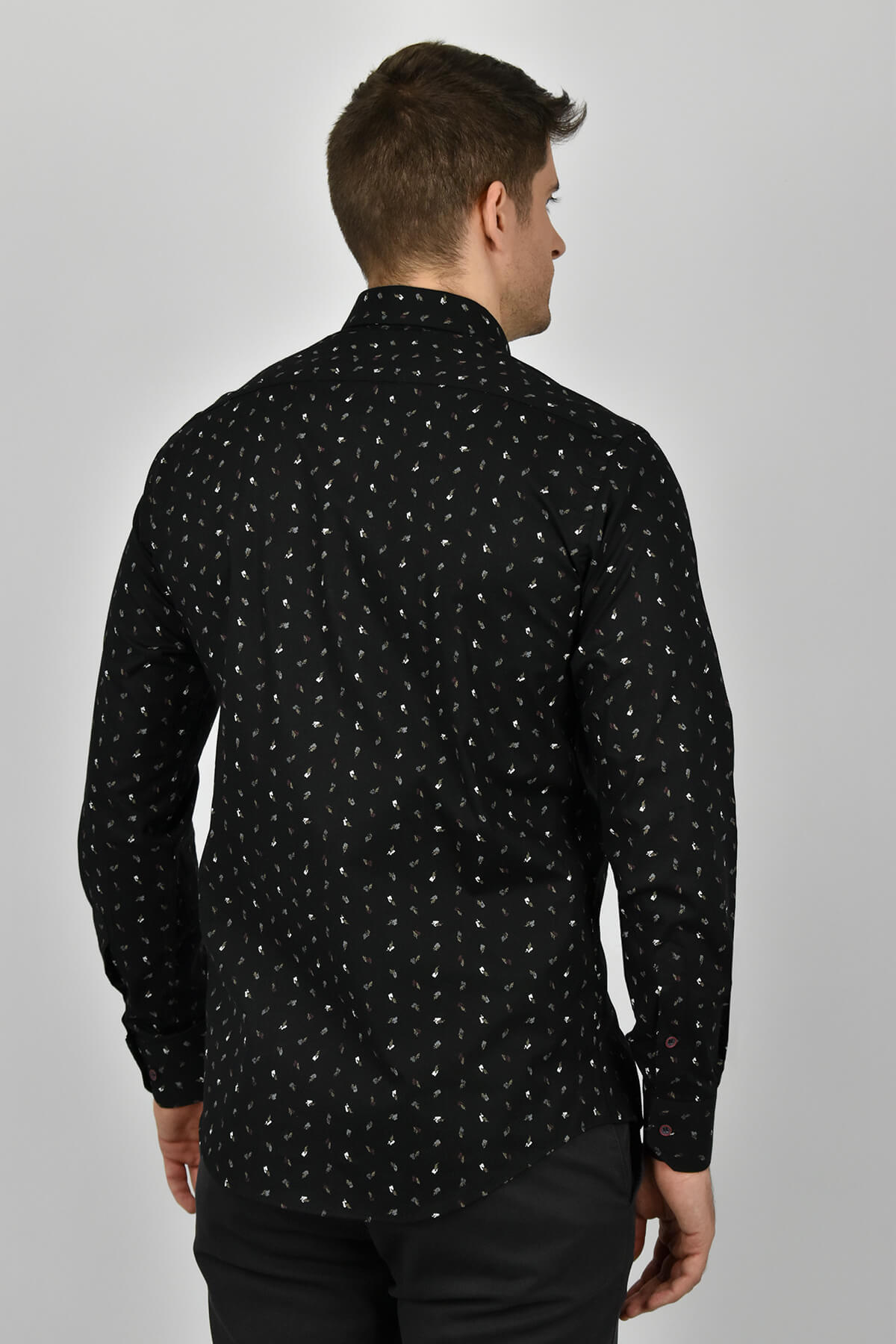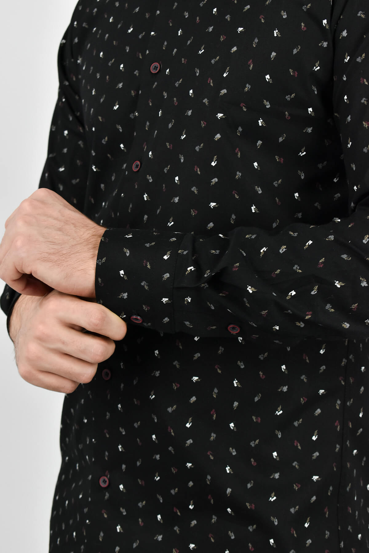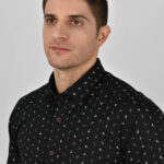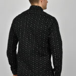 Endeson πουκάμισο μαύρο με μικροσχέδιο σε γκρι, λευκούς τόνους και κανονικό γιακά, πατιλέτα και μανσέτες με κουμπιά σε στενή γραμμή.
