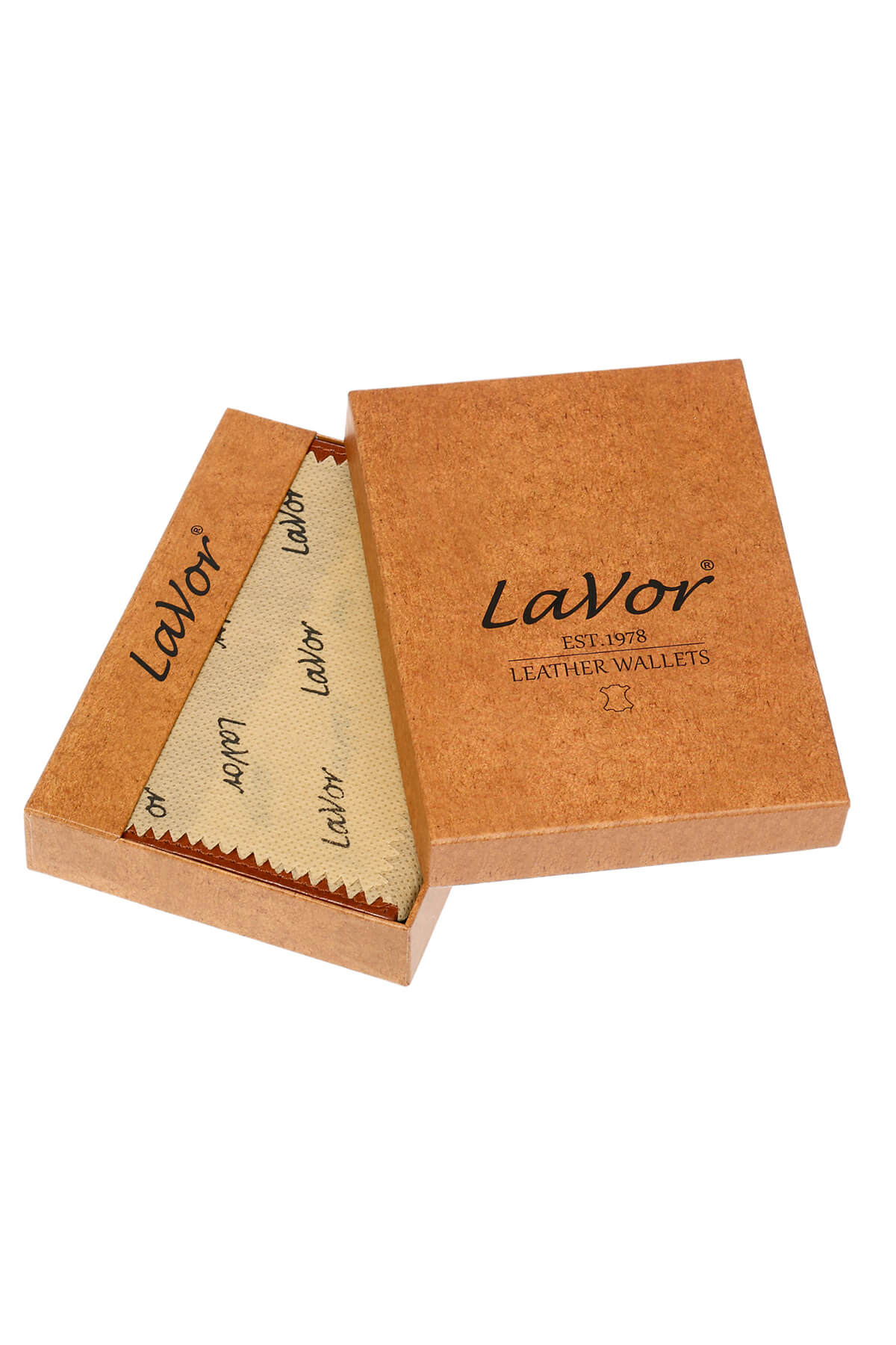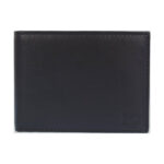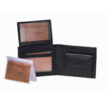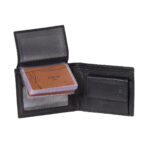 Men’s wallet, which features multiple internal compartments and a company logo on the front. (Composition.)